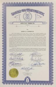 On May 4, 2015, John E. Lawrence retired from Washtenaw Community College in Ann Arbor Michigan, where he served as a professional instructor, the head of the Music Performance Program, and the Chair of the Performing Arts Department. During his tenure at WCC, John developed: 22 courses, three music performance certificate programs, wrote 16 instructional books on guitar performance, and developed and produced his legendary Living Legend Series. Governor Rick Snyder presented The State of Michigan Special Tribute Award to John Lawrence for 36 years of service and for his remarkable achievements at Washtenaw Community College and to the greater community as a whole.