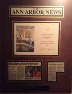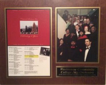 In 2008, the Washtenaw Community College Jazz Orchestra, under the direction of John E. Lawrence, was invited to perform at the National Christmas tree Lighting Ceremony in Washington DC. This award displays a photograph of the WCC Jazz Orchestra and an actual program from the performance which has a photograph of the National Christmas tree with the White House in the background.