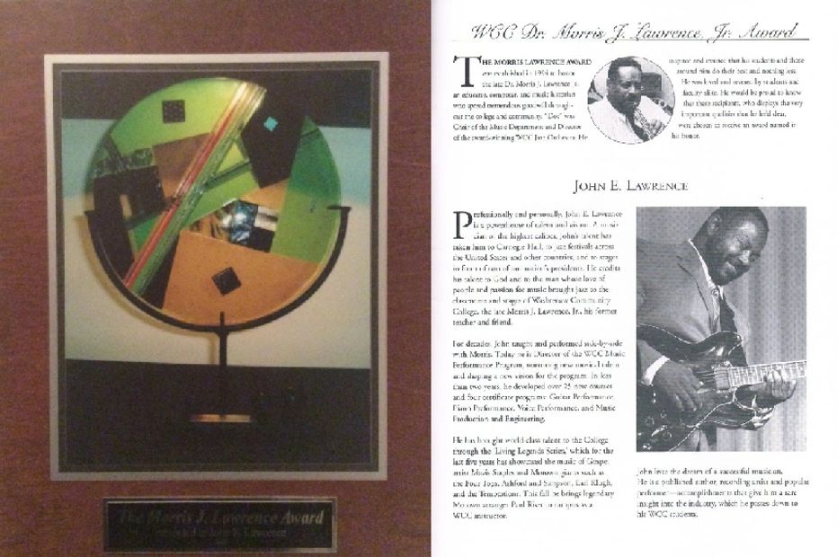 The Morris Lawrence Award was established in 1994 to honor the late Dr. Morris J. Lawrence, Jr., an educator, composer, and music historian who spread tremendous goodwill throughout the college and community. “Doc” was the Chair of the Performing Arts Department and Director of the award-winning WCC Jazz Orchestra. He insisted that his students and those around him do their best and nothing less. He was loved and revered by students and faculty alike. He would be proud to know that these recipients, who possess the very important qualities that he held dear, were chosen to receive an award named in his honor. In May of 2008, John Lawrence received the highest level award presented to an instructor at Washtenaw Community College. “This award is extra special and dear to my heart because the award was named after my friend and mentor Dr. Morris J. Lawrence, Jr.” John E. Lawrence
